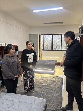 走访期间,李庆峰与同学们亲切交流,详细询问大家的日常生活、学业进展与假期安排。他勉励同学们珍惜留学时光,努力学习汉语,深入体验中国文化,未来成为中外友好交流的桥梁,为促进世界各国人民之间的理解与友谊贡献力量。同时,他也特别提醒留校及外出旅行的同学增强安全意识,离校返校及时向学院报备,遇到困难随时联系辅导员或班主任,确保度过一个平安、祥和、愉快的春节假期。