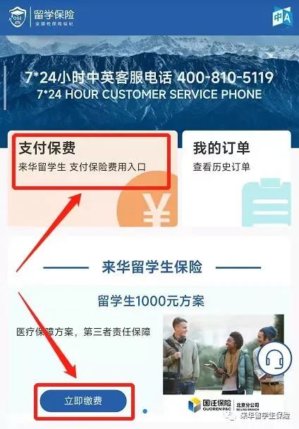 3. 请选择就读的学校以及保险方案,点击“保险缴费”。